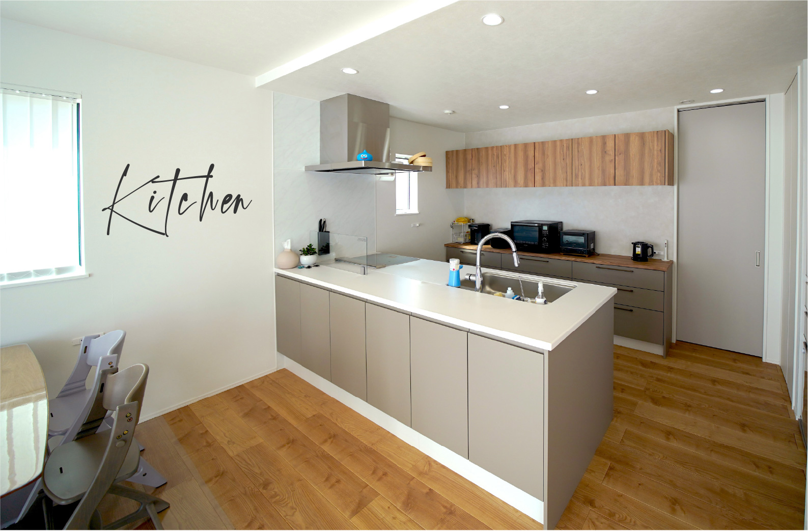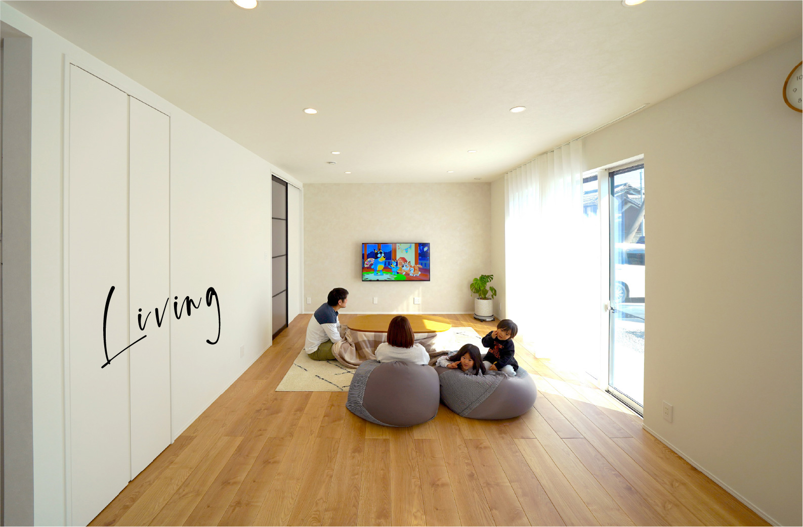 大きな掃き出し窓からの採光。無垢調フローリングによる一層のあたたかみ。